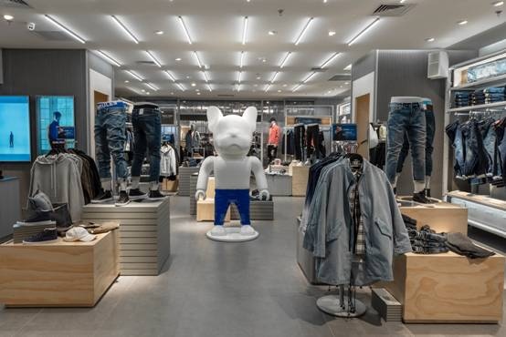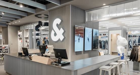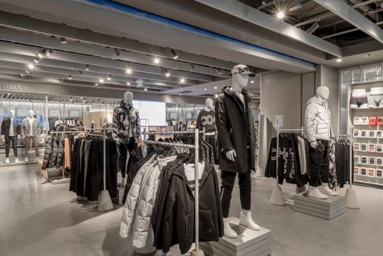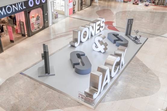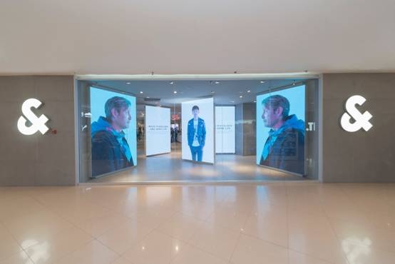 杰克琼斯罗斯福广场旗舰店面积近1000平米,极具冷峻的北欧风格,融合了硬朗、摩登、现代的都市质感。店铺主橱窗由五块高3米宽2米且科技感十足的震撼无边框高清LED屏幕打造而成,以全息投影的呈现方式打破了以往的海报展示模式;完全开放和透明的设计,低密度的产品陈列,更私密的VIP更衣室更易吸引消费者对店铺内部的探索欲和好奇心。