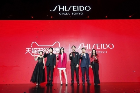 资生堂集团高档事业部总经理谢萍、资生堂全球品牌总监冈部义昭、资生堂品牌中国区彩妆代言人唐嫣、资生堂中国区总裁藤原宪太郎、天猫大快消美妆及横向营销总经理陈曦、天猫大快消大客户总经理王亿红共同庆祝资生堂彩妆全新发布