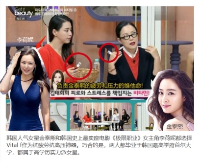 明星艺人不休息,通告一个接一个,最主要的原因无非就是担心自己随时会过气,即使再红的明星,也会顶着很大的压力,除了减压,应该要有可以维持比较好的精神状态,应对工作。即使再累,再熬夜,也需要充足营养,时刻保持好气色,毕竟娱乐圈从来都不缺努力的新人。小编就在一档韩国的综艺节目发现,金泰熙和李荷妮一直都服用这款vital f用来对抗疲劳和压力。更巧合的是,两个都属于韩国的首尔大学毕业。