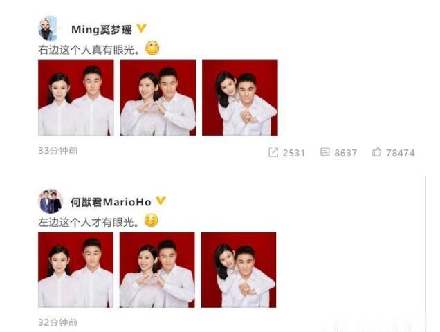 两人的微博配文也非常有意思,奚梦瑶说右边这个人真有眼光,何猷君则说左边这个人才有眼光,一个笑意直视,一个害羞低头,两个表情包仿佛看到两人现场拍结婚照时的表情,也是非常魔性了。