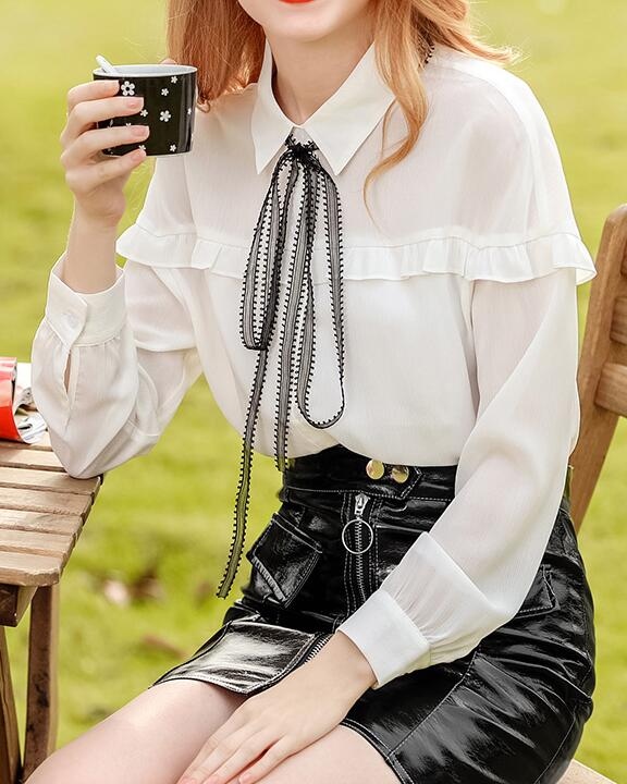 像模特这样用短裙+花边衬衫的穿法也是很时髦呢,白色衬衫搭黑色短裙不管什么风格和气场的女生都能驾驭,今年春天不妨试试像香奈儿秀场上面那样穿吧。