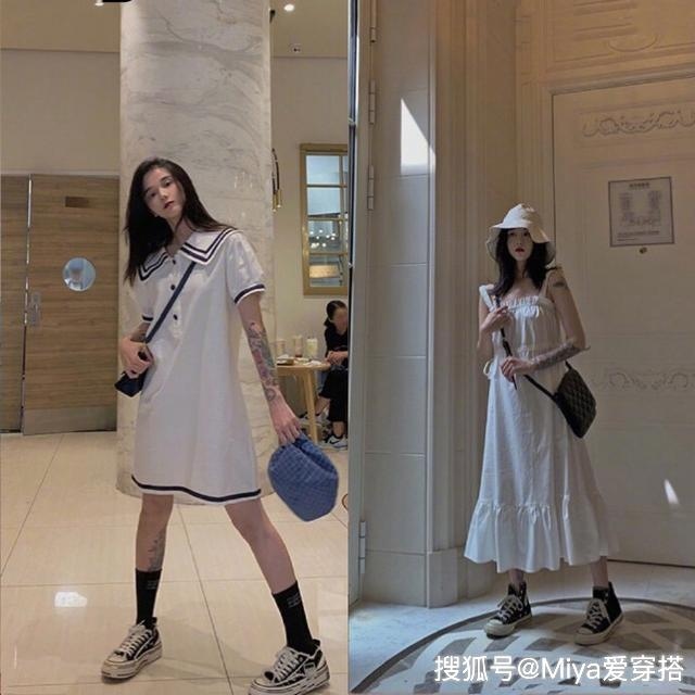 在我眼里,连衣裙应该是最适合女生穿搭的一款单品了,不仅可以展现专属于女性的柔美,同时也是极显气质的穿搭。而往往平价的连衣裙都可能会发生撞衫这样的尴尬事情,所以心机搭配就很重要了。左图的直筒白色连衣裙是偏向学院风的,而搭配黑色的中筒袜就更加的有学院风了,但是黑白色调有会显得太单一了。所以搭配一款蓝色的帽子就起到了点亮做作用。右图的画风则是偏向森女系的,纯白的渔夫帽搭配连衣裙简约低调,大帽檐半遮面的样子增添了不少神秘感,拍照最适合了,很少ins少女风。