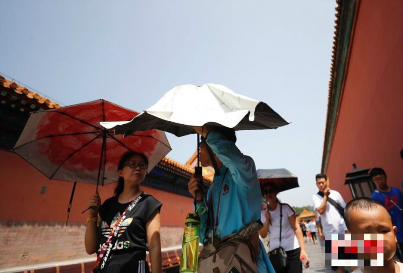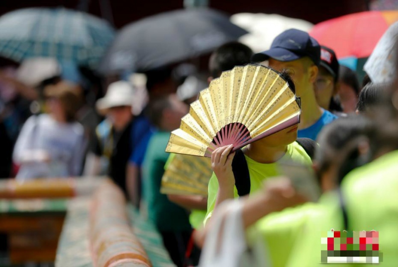 7月30日,北京雨后气温回升,故宫景区游人如织。图为游客用折扇挡住面部遮阳。中新社记者 杜洋 摄