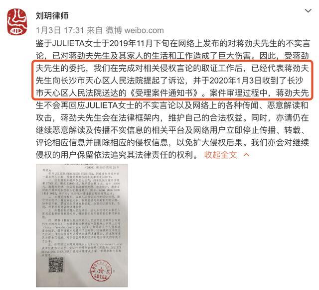 蒋劲夫跟日本上一任中浦悠花家暴一事处理后,回到国内开展往来了乌拉圭女友朱莉叶,往来短短几个月的时刻,蒋劲夫再次被曝出家暴,朱莉叶在ins说自己被蒋劲夫家暴,无法挑选出国逃避。蒋劲夫否定家暴一事,而且让律师申述朱莉叶,对此,朱莉叶表明并不怕申述。