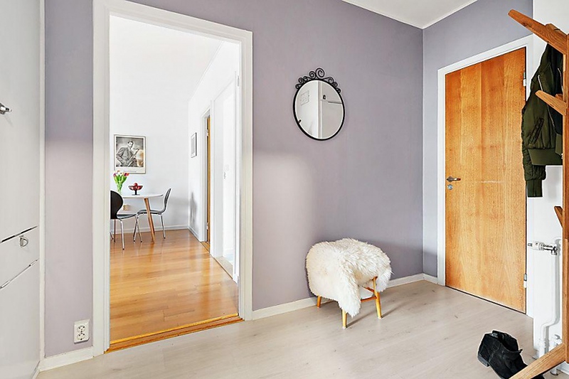 一进门的大玄关,蓝紫色的墙面、米白色的地板,与对面客厅是两个天壤之别的风格,中心以实木压边条为联接。相对于地砖来说,实木的压边条做门槛,它愈加的温暖、舒适,更简略中和两个空间的颜色。
