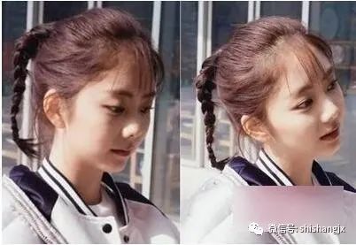 栗色烘托的中长发向上靠拢做挺拔的马尾辫扎发,将马尾辫分红三股做了简略的麻花辫编发,发顶 部分的发丝挑松,额前还有少量的碎发刘海,很有芳华气味的马尾扎发发型。
