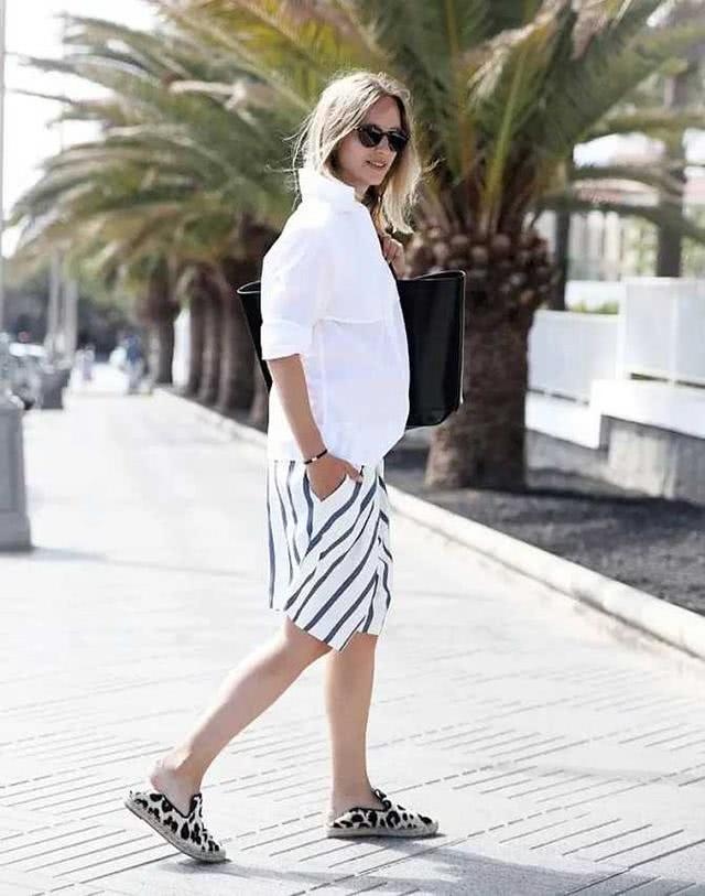 新鲜而又精约的白衬衫,时尚大方,结合宽松的版型,合适各式胖瘦妹子身形,上身穿戴惬意感十足。衣摆轻轻的收口规划,穿戴舒适精约,下身的宽松条纹短裤,润饰出纤细的腿型,且穿戴清凉感满格。一双简略的豹纹单鞋相随,打造出闲适安闲的出行风情,调配一个黑色的大包包,彰显出率性十足的街头风格