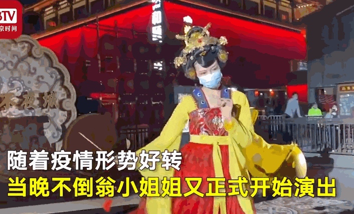 3月20日,西安大唐不夜城不倒翁正式开端康复扮演,由于疫情原因,现在艺人们戴口罩扮演。现场观众需排队距离1米观看,比较疫情之前显得非常冷清。