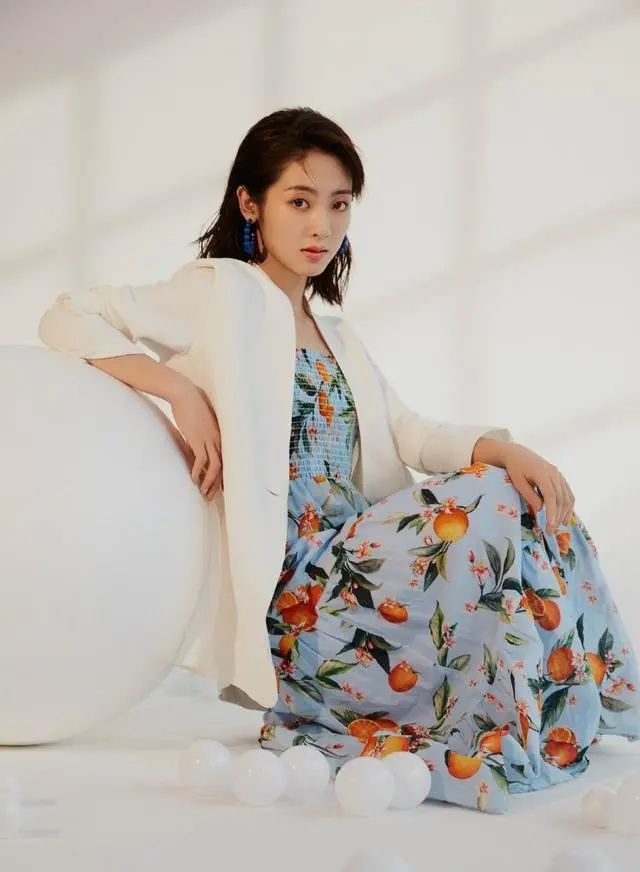 一身长款蓝色连衣裙亭亭玉立,满裙子的生果图画十分亮丽,让咱们马上感觉春天的气味扑面而来,裙子选用收胸的版式规划,完美地勾勒出了女人美丽的腰身,裙子长长的下摆颇有波西米亚风情,调配一个白色的西服外套增加了一些慎重感,初春时节仍是有些微冷的,这样的考虑算是很交心了!