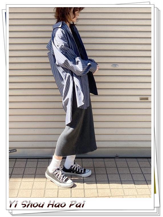 条纹衬衫具有宽松但赋有知性的形象,可轻松穿搭休闲帆布鞋。关于下装,挑选紧身裙,收紧oversize上衣,并添加穿搭感。