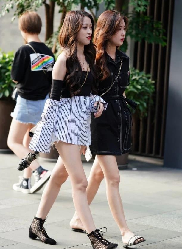 这一对闺蜜出街应该是现已商议好穿什么衣服了吧,都穿戴一身黑,只要左面小姐姐的衣服还有半截白色的部分。她的闺蜜穿戴全黑的西装裙,上面有白色的缝线,显得很有质感,可是仍是黑色为主导。她脚踩一双黑色的平底拖鞋,尽显轻松随性的风格!