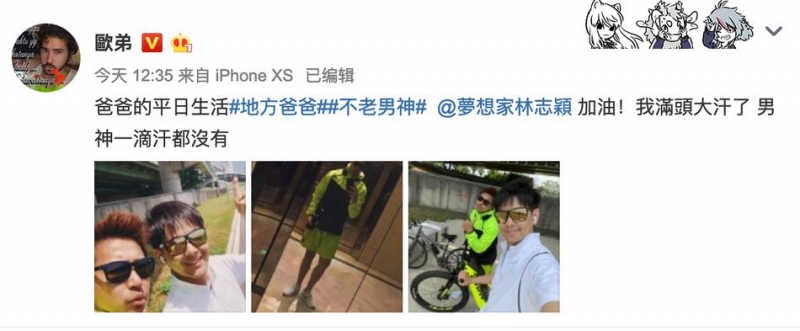 5月13日,欧弟在个人交际账号上共享了一组自己外出运动的相片。还配文写道:“爸爸的素日日子,加油!我满头大汗了,男神一滴汗都没有”。欧弟口中的不老男神便是林志颖了,没想到两人日子中也是十分要好的朋友。