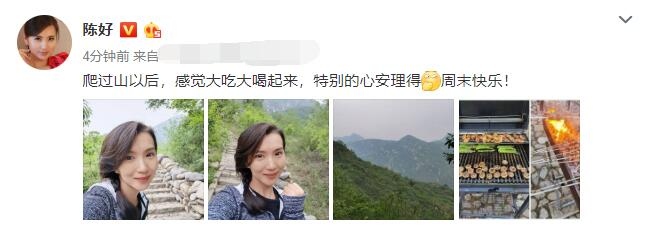 5月16日,陈好在微博晒出了一组相片,配文说:“爬过山今后,感觉大吃大喝起来,特别的心安理得周末高兴! ”