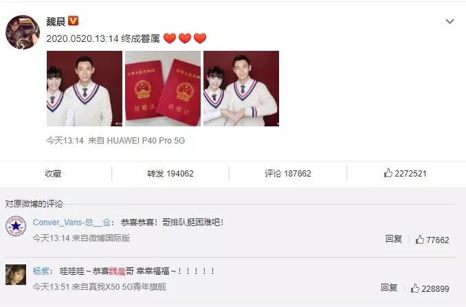 不过小编看到最感动的仍是#魏晨成婚#,从《高兴男声》开端就喜爱了这个长的帅帅的小伙子,13年了总算看到他的好消息。