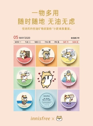 2020年5月,韩国自然主义品牌innisfree悦诗风吟携手微信人气表情包小肥柴,全新上市限量版矿物质散粉。呆萌可爱的小肥柴针对每天的出油困扰实力演绎散粉“一周使用说明书”,从周一到周日,帮助你轻松解决你的出油烦恼,让你365天无“油”无虑;更能一物多用,随时随地控油、打底、定妆,陪你开心度过每一天。