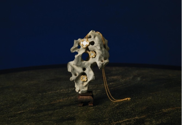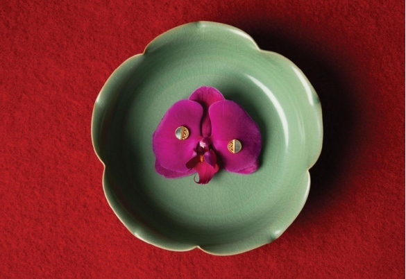 “築”系列作品以足金打造简约时尚的半立体外形,镶嵌其间的贝母散发天然光泽,映衬传统元素与现代设计交融的魅力。