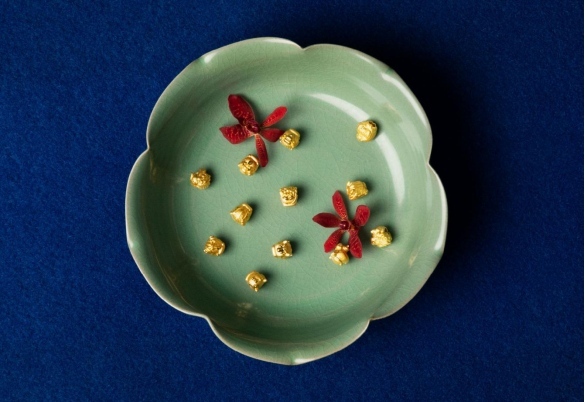 玲珑精致的屋脊兽足金串珠,落于如雨后初霁般宁静的天青色汝瓷碗中,将家宅平安、祥瑞安宁的美好“築”福趣味呈现。