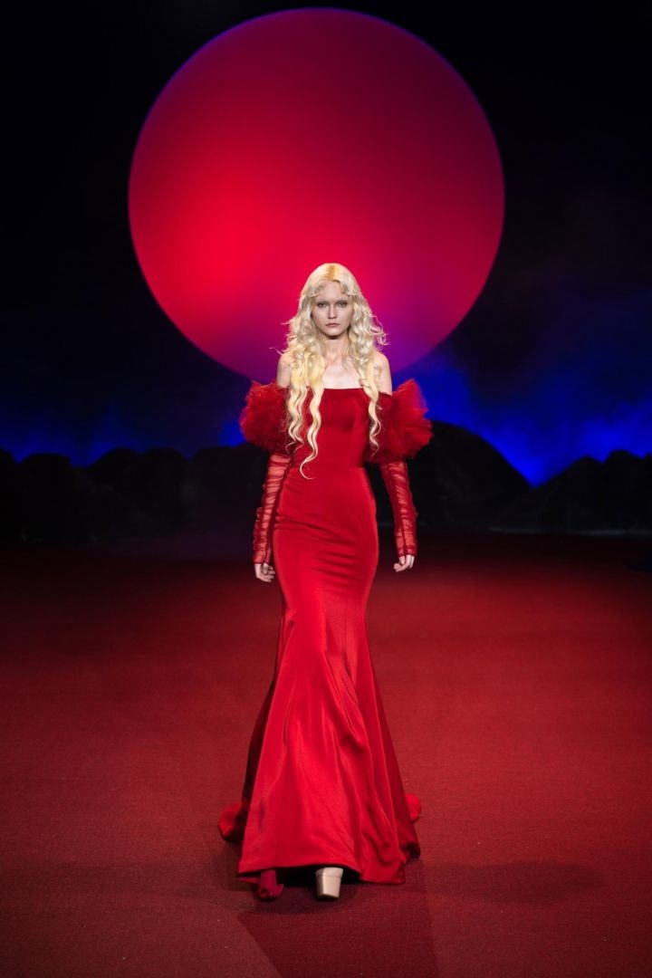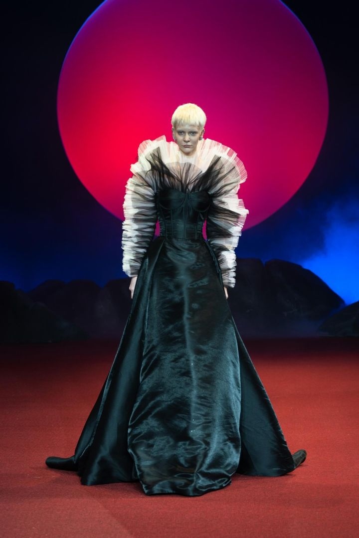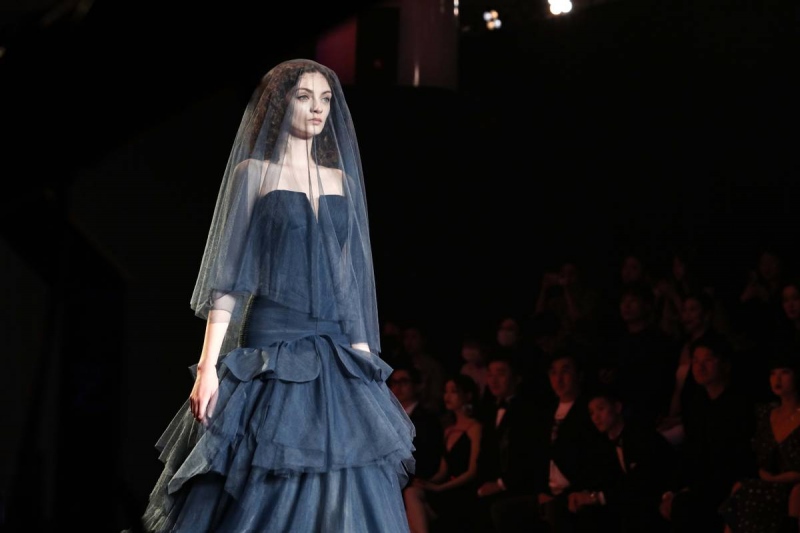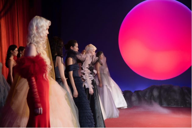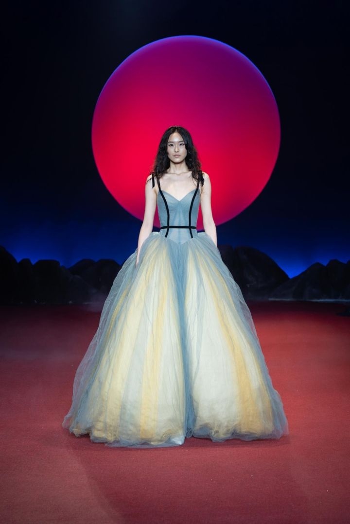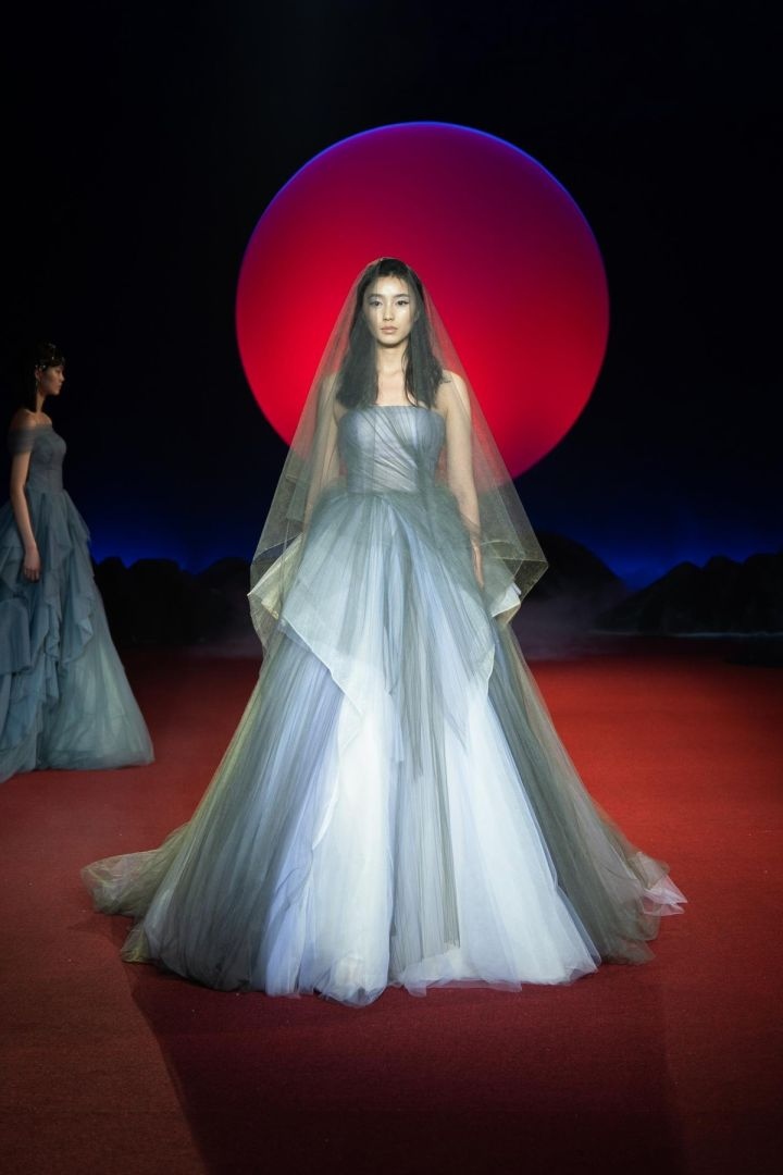 本次大秀置景完全沿用新品理念,正如这一季主题,是对于绚烂色彩的无限探索。新品系列一反常规婚纱礼服特点,弱化珠绣与蕾丝的装饰,运用意想不到的色彩叠配融合,创造出以纱为墨作画的艺术效果。礼服融入维多利亚时期流行的褶皱、缎带、荷叶边等服饰形式,溯古宫廷时代的拉夫领、灯笼袖、花簇袖等元素,打造多层次的立体剪裁。以飘逸的轻纱讲述古典之浪漫,再现宗教油画般神秘与典雅。