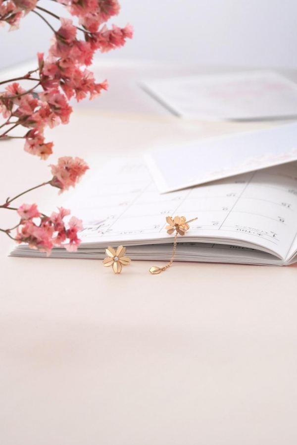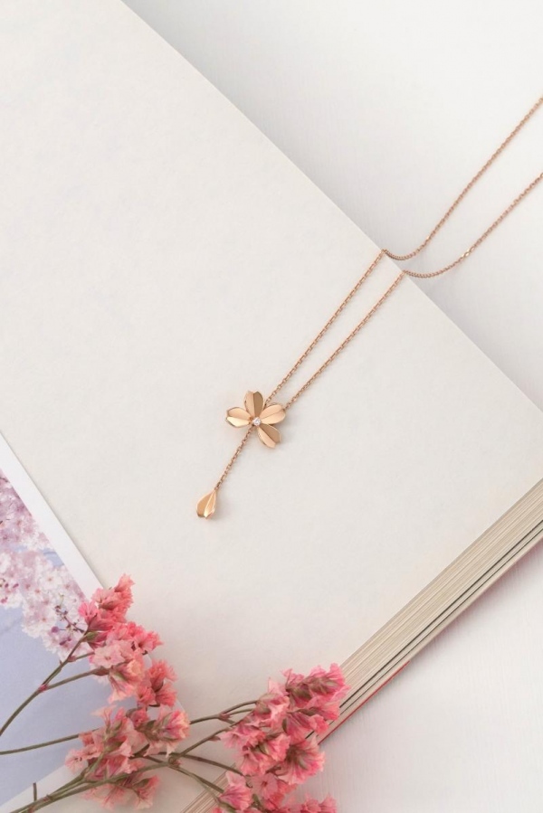 阳春三月,正是游春赏樱的最佳时节,一阵微风拂过,花瓣随风轻舞,徜徉其中沉醉不已。搭配周生生Journey「遇见」系列樱花设计主题珠宝漫步于樱花大道,愉悦更是涌入心间。系列饰品以18K玫瑰金打造,色调柔和浪漫。其灵感源自传统折纸工艺,明朗的折纸线条生动还原樱花的立体形态,晶莹的圆钻点缀于馥郁的花蕊之上,宛若花瓣缓缓飘落瞬间的轻盈和灵动。其中一片花瓣可自由调节链身长度,随身而动,更显温婉柔美。