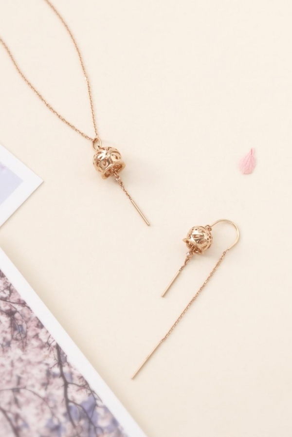 伴随着徐徐春风,清脆悦耳的风铃声不时响起,余韵悠长。Journey「遇见」系列18K玫瑰金风铃饰品以“风铃”为灵感来源,小巧的风铃采用镂空设计,配以绚烂樱花图案,清雅演绎和风风铃的细致与简洁,恬淡怡然的美感呼之欲出。徜徉在微风之中,饱含和风典韵的风铃摇曳于耳畔及颈间,宛如一首琴瑟和鸣的乐曲,举止间不时散发添加优雅的气息。