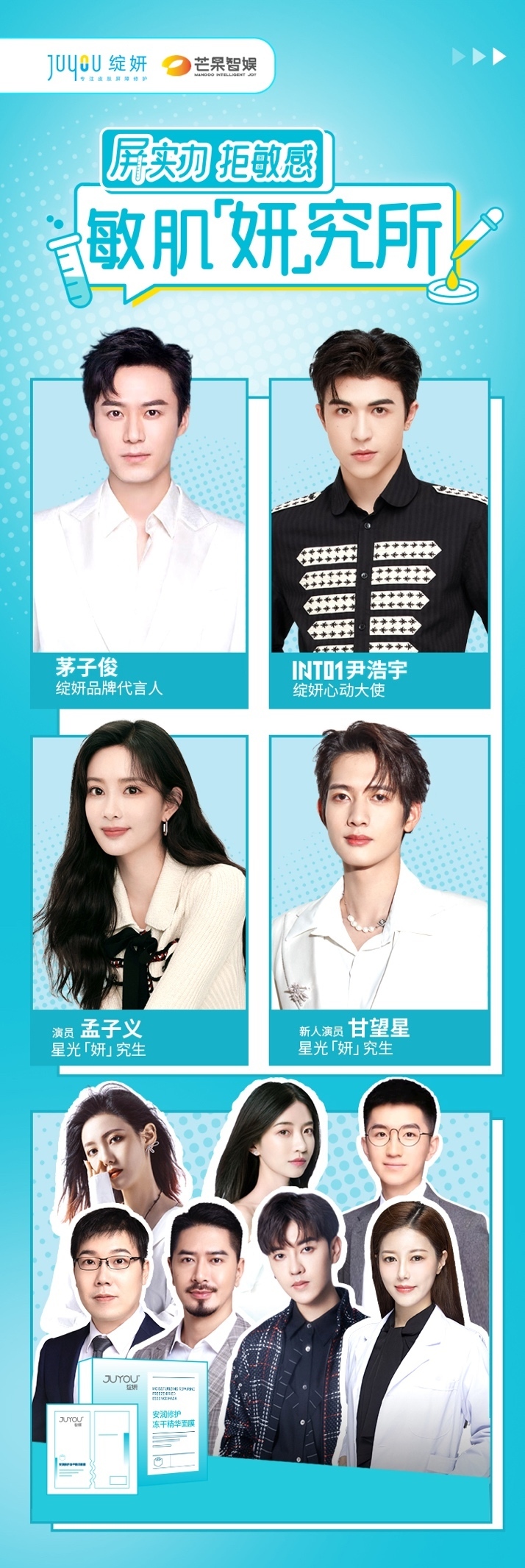 据悉,在本次“敏肌妍究所”直播微综艺中,绽妍与芒果智娱达成了深度合作,联合明星艺人资源为绽妍品牌进行全程助力。将妍究生聊天室、妍究生秘密大公开、妍究所大闯关、敏肌实验小课堂等一系列创新玩法融入其中。出现在直播间的,除了绽妍心动大使—INTO1尹浩宇、星光“妍”究生—孟子义、甘望星,还有多位KOL、医生等多领域达人从自己专业角度出发,对于敏肌话题进行解读。绽妍“敏肌妍究所”受众覆盖全面,在专业深度与传播广度上皆有涉及。